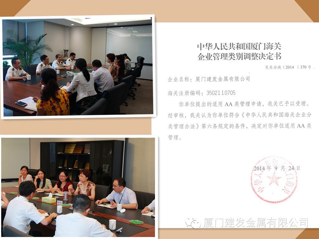 近日,經(jīng)中華人民共和國廈門海關(guān)審核批準(zhǔn),廈門建發(fā)金屬有限公司順利獲得海關(guān)“AA類管理企業(yè)”資質(zhì)。